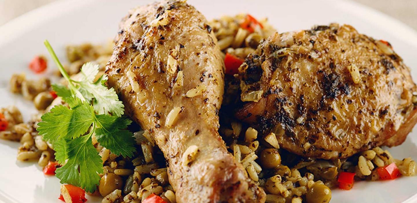 - 4 Add the chicken stock, remaining beer, and chicken pieces to the skillet, bring to a boil. Stir in aji (if using), rice, peas and 2 cups (500 mL) cilantro purée.