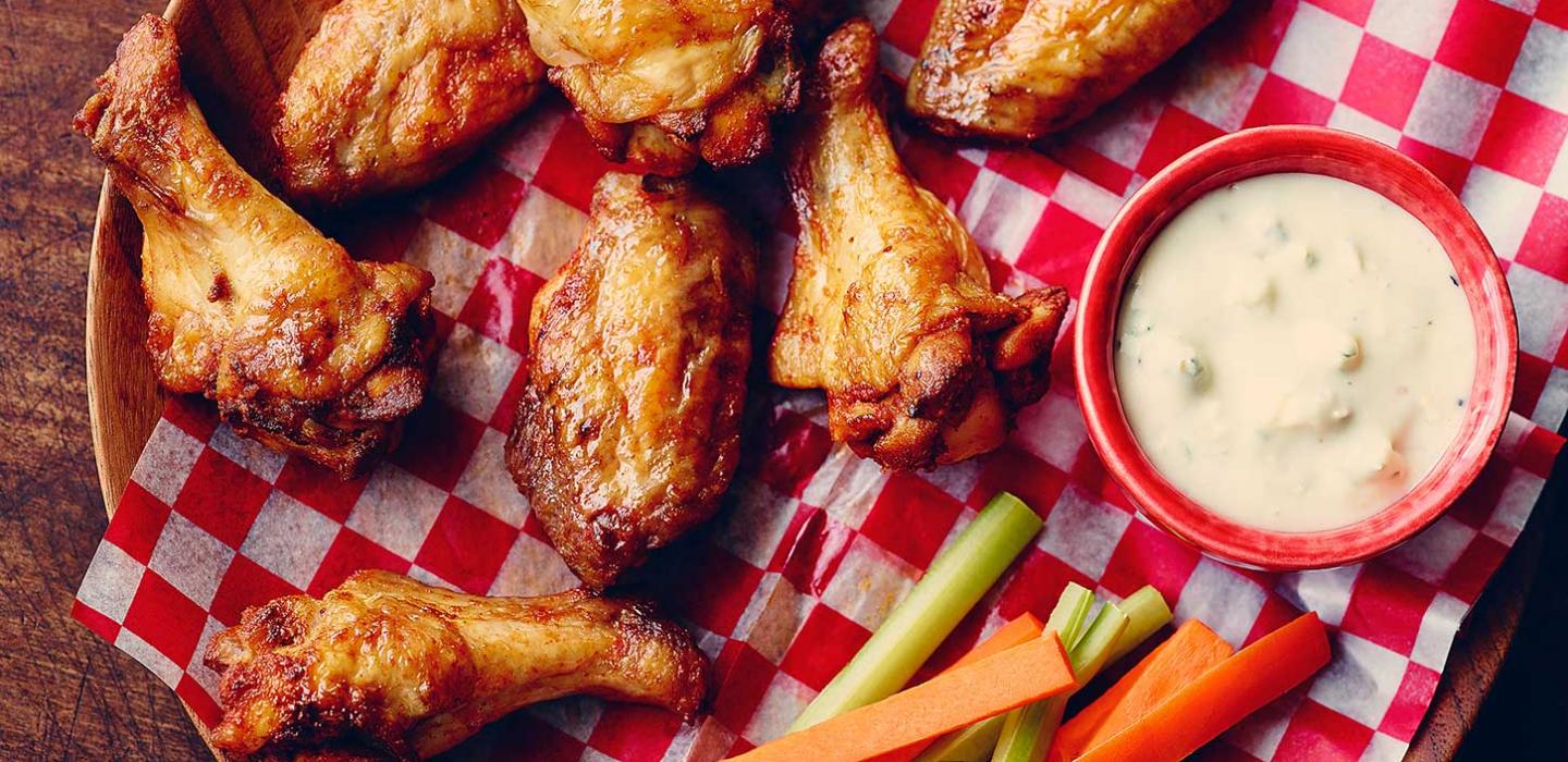 - 4 Bake in centre of 425°F (210°C) oven until browned, from 40 to 45 minutes. (If wings are on a rack, they don’t need to be turned.) Great served with a blue cheese dip as is the custom at the famous Anchor Bar in Buffalo, New York.