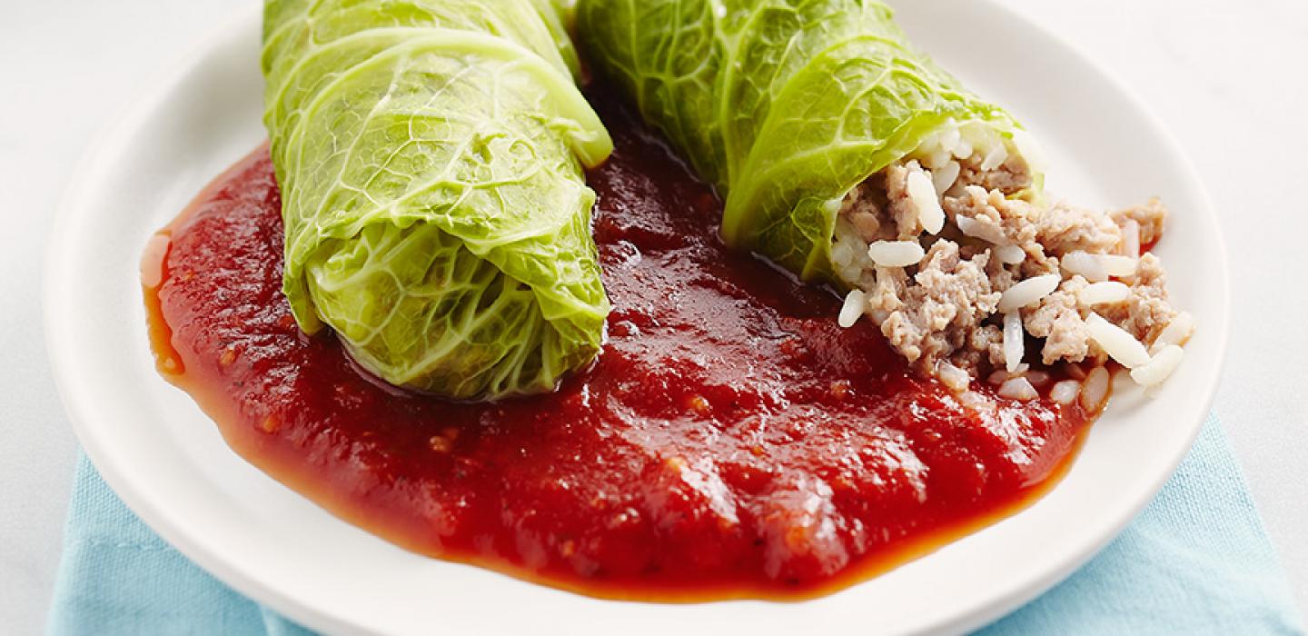 - 4 Place approximately 1½ to 2 Tbsp filling on cabbage leaf and fold tucking in ends. Place rolls into a greased pan which has been lined with the ribs cut away from the cabbage leaves and any extra leaves.