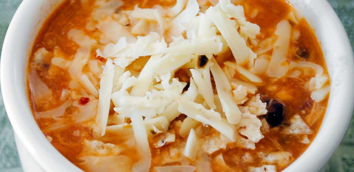 - 3 To serve, ladle into soup bowls. Garnish with crushed tortilla chips, reserved cheese and cilantro to taste.