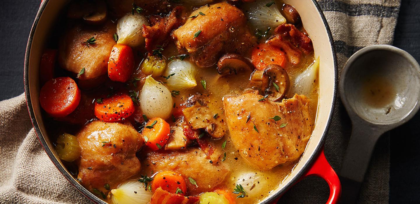 - 5 Slice bacon into about 1 inch (2.5 cm) pieces and brown until crispy in pot. Remove bacon from pot and add to plate of chicken.