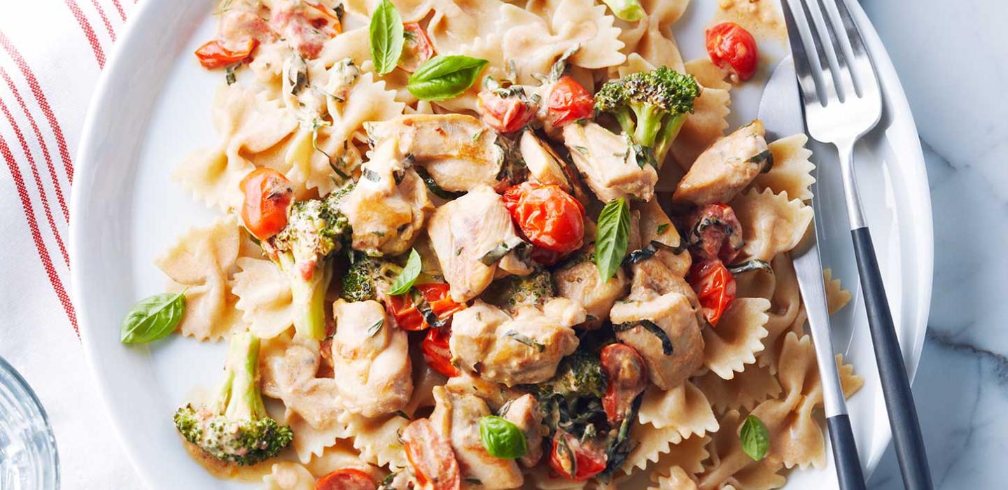 - 7 Drain pasta and place over dinner plate. Pour creamy chicken and vegetables over. Sprinkle with shredded Asiago cheese. Garnish with a few sprigs of fresh basil (optional garnish).