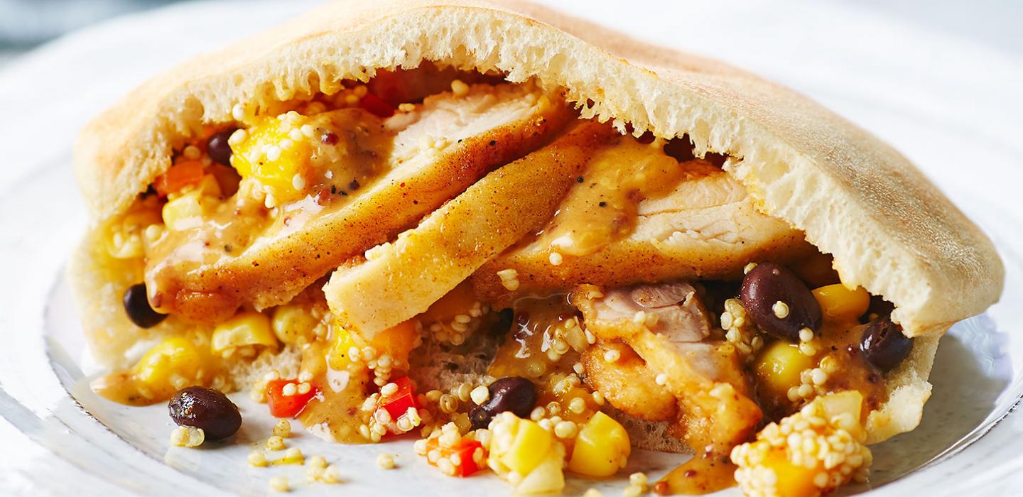 - 5 Using a slotted spoon, fill pita half full with the Quinoa Salad. Add Ginger Ale Chicken and drizzle pan sauce on top.
