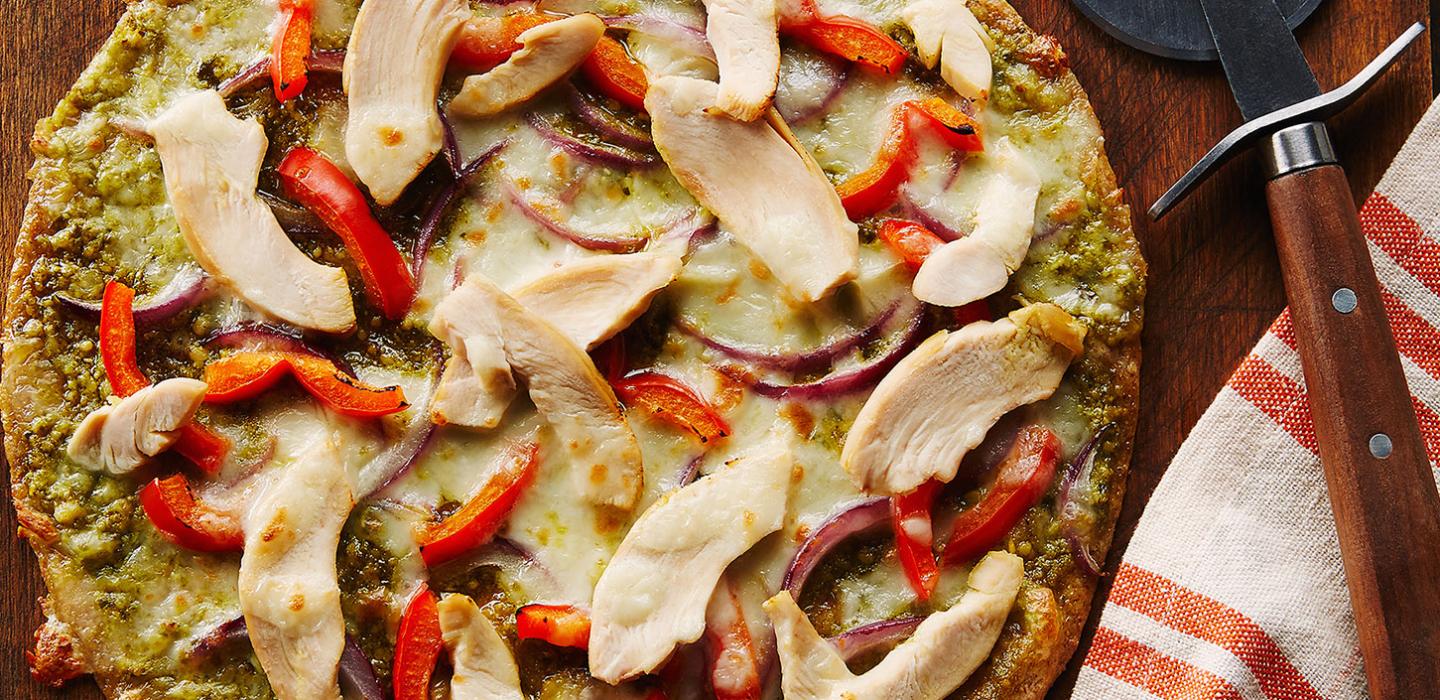 - 2 Top with cooked sliced chicken, diced onion and sweet red pepper. Sprinkle with shredded cheese.