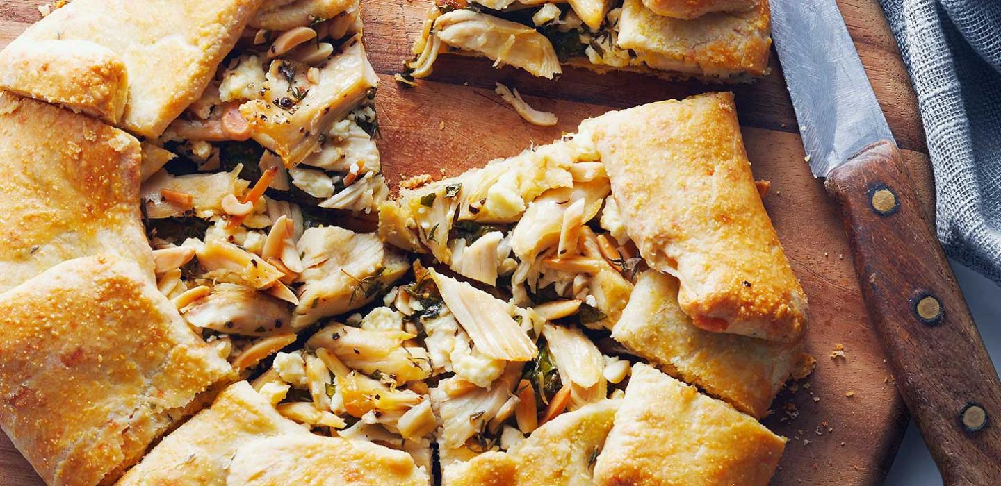 - 6 Remove the rolled out crostata dough. Brush the egg and water mixture to make a 3-inch border. In the center, layer the caramelized onions, spinach, chicken, feta and toasted almonds. Sprinkle the top with salt, pepper and fresh thyme. Brush with olive oil.