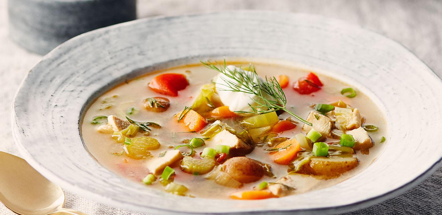 - 4 To serve, remove bay leaf. Ladle soup into bowls and serve with a dollop of sour cream and a fresh sprig of dill (optional garnish).