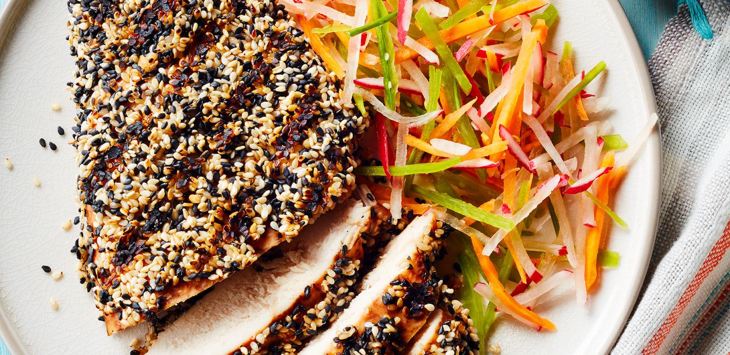- 4 Mix black and white sesame seeds on a plate. Remove chicken from teriyaki sauce and throw out bag. Pat chicken with paper towel to remove extra sauce.
