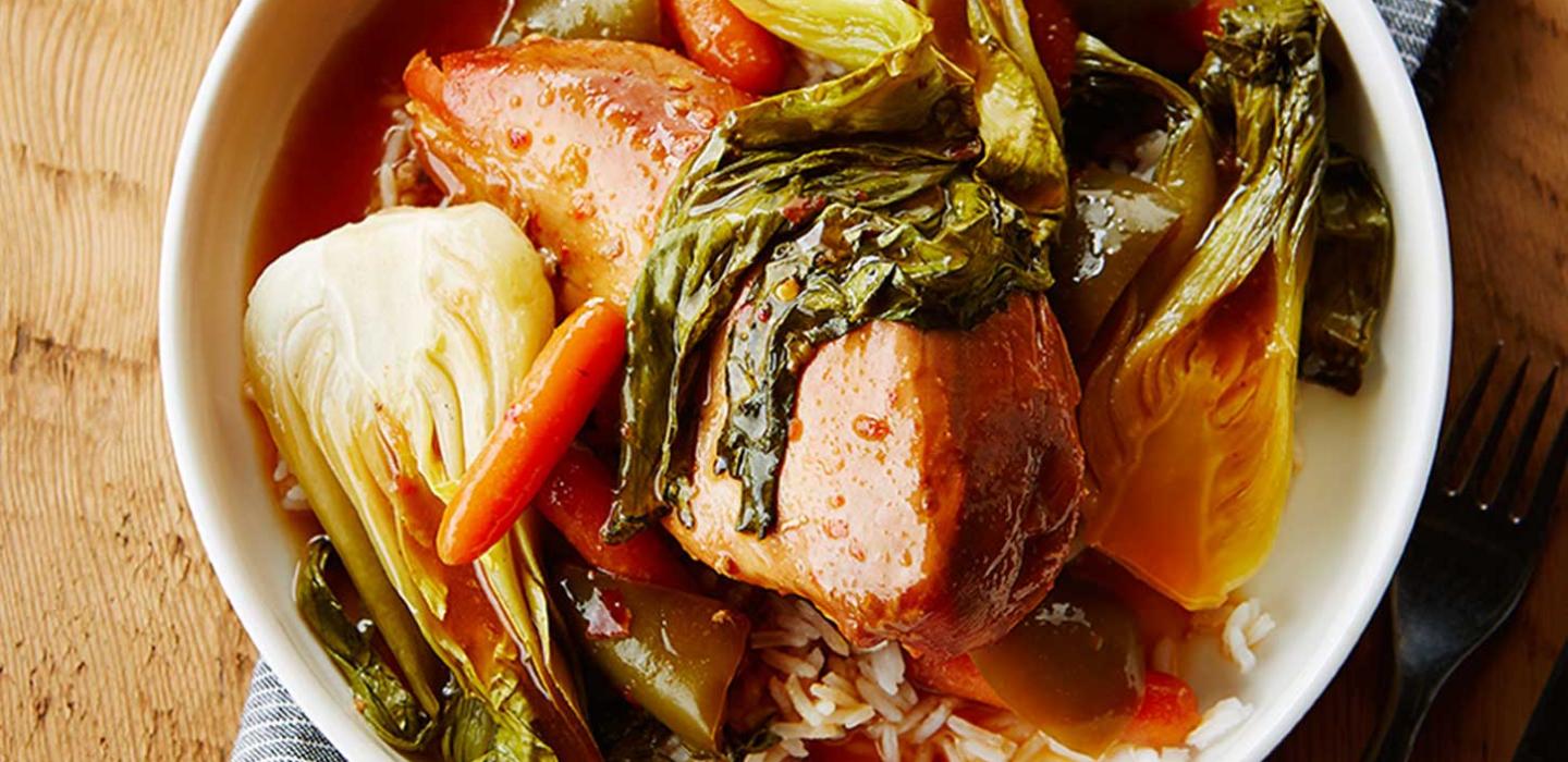 - 2 Scatter carrots on top. Slice onion in half. Place flat side down on a chopping board and slice about ⅓-inch ( 0.8 cm) thick. Add, separating pieces as you add. Scatter with peppers. Gently press down on vegetables. Cover and cook for 3 to 4 hours on high or 5 to 6 hours on low. Then stir in bok choy or snow peas, if using. Cover and cook until done as you like, from 5 to 15 minutes. Serve over rice.