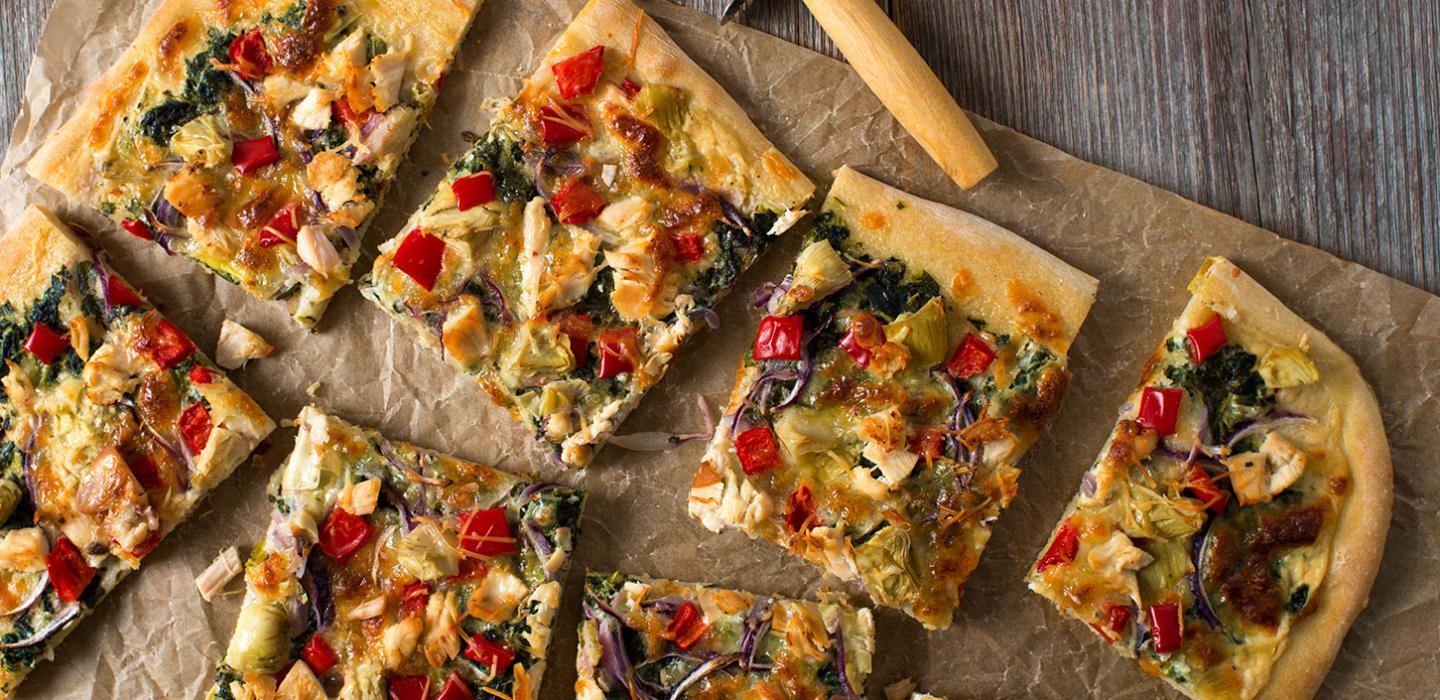 - 2 Stir the sauce with the spinach and spread over the dough, leaving a ½-inch (2 cm) border all the way around. Scatter chicken, artichokes, red pepper and red onion over the sauce. Sprinkle mozzarella and Parmesan over the toppings.