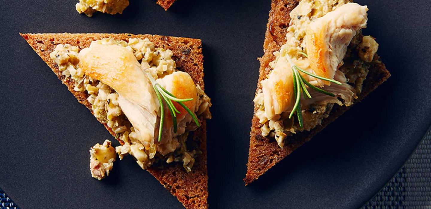 - 3 Spoon 1 tablespoon (15 mL) tapenade onto each toast point. Top with shredded chicken and a small sprig of fresh rosemary. Remaining tapenade will keep for up to 4 days in an air tight container in the refrigerator.