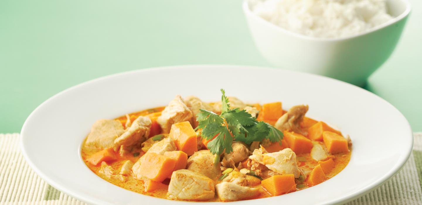 - 3 Add the chicken stock and the diced sweet potato. Bring to a boil, reduce heat and simmer for 25-30 minutes or until sweet potato is completely tender but still holding its shape and the sauce has reduced slightly. Check seasoning and add salt if needed.